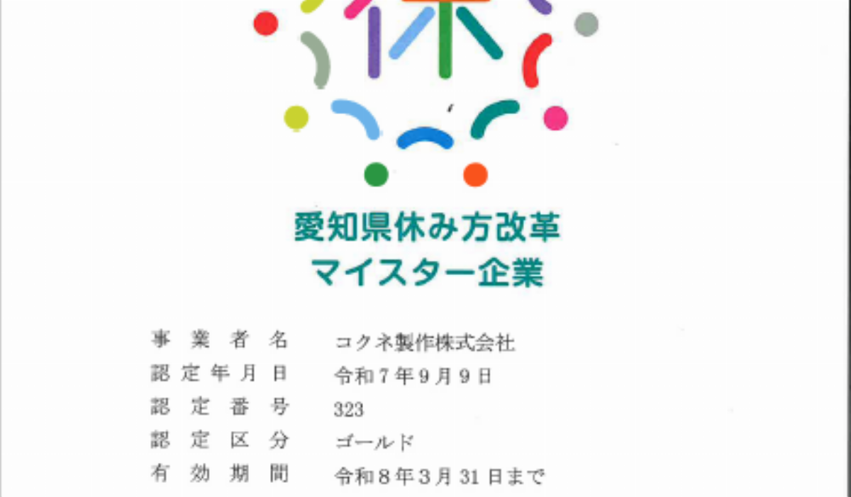 この度コクネ製作(株)は「愛知県休み方改革マイスター企業」のゴールド認定を頂きました。既にブロンズ認定は頂いておりましたが、今回ゴールド認定を頂くことができ大変光栄に思います。弊...