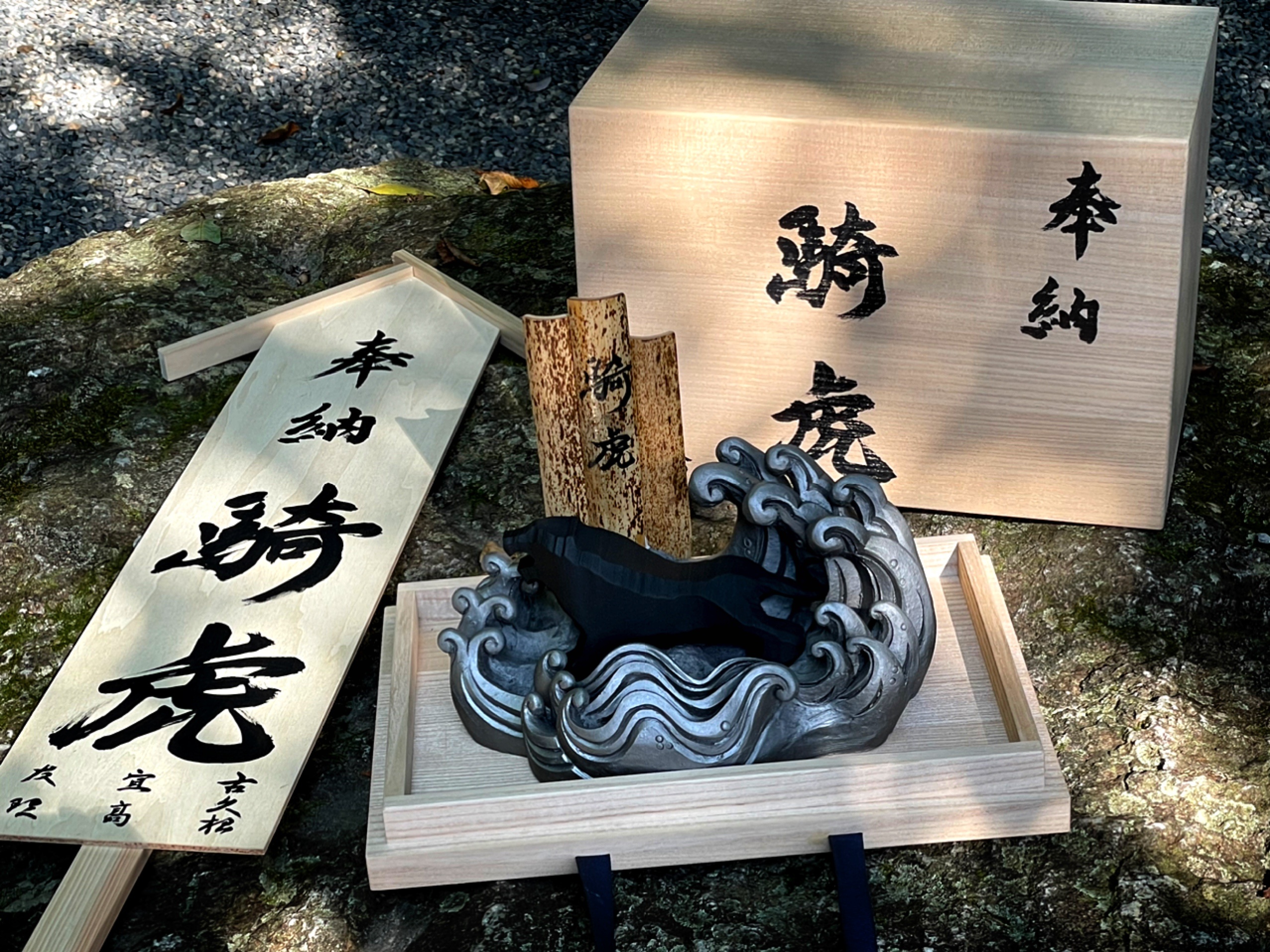 鬼師加藤 宜高の「荒ぶる波」は現世界を表しています!その荒波の中で前を向き覚悟を決めている「寅」は当社の鋳物!竹工芸作家・故鳥居一峯様の貴重な虎竹は奥様とりい しとこ様からいただいたもの!そこには書家森脇 友理の「書」が入り素晴らしい作品が完成しました!