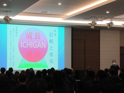 1月6日に、西尾市にある西尾コンベンションホールを貸し切り、コクネグループ新年合同式典を開催致しました。500席の催事が出来る広い会場で、ソーシャルディスタンスを確保した席割と検温測定、消毒、マスク着用と感染対策を万全に行い、式典には両社合わせて総勢150名の社員が参加しました。  社長の年頭挨拶に始まり永年勤続表彰や改善提案表彰なども行われ、雪が降る中での開催でしたが、2年ぶりにコクネグループ全社員が揃って新年を迎えることが出来ました。社長の挨拶にありました今年のスローガン「成長と挑戦」を意識し、グループICHIGANとなって業務に精進して参ります。本年もどうぞよろしくお願い致します。