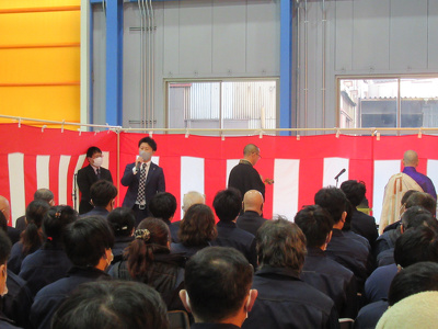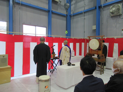 2022年12月に本格稼働を開始した新工場(詳しくは12月9日のニュースをご覧ください。)ですが、2023年1月6日に毘沙門天妙福寺様のご祈祷の元、増設工場の竣工式が執り行われました。宮島社長からの挨拶では工事関係者の皆様への感謝のお言葉がありました。この日は一粒万倍日と天赦日が重なった「新しい事を始めるのにとても良い日」ということで大変縁起の良いスタートとなり、社員一同更なる発展を目指していく所存でございます。今後ともよろしくお願い致します。