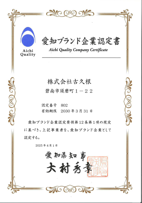 (株)古久根が愛知ブランド継続認定をいただきました。