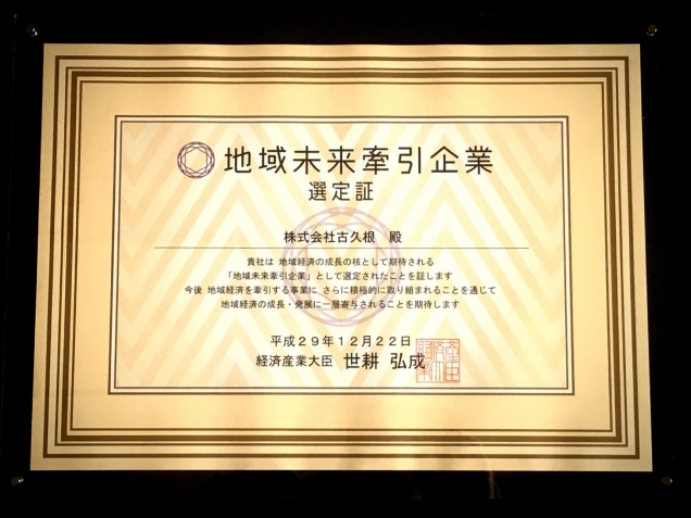 2017/12/22 地域未来牽引企業に選定されました 地域経済の成長の核として期待される『地域未来牽引企業』として㈱古久根が選定されました。 名の通り、地域の未来を牽引していく企業として恥じぬよう、今後も一層精進して参ります。