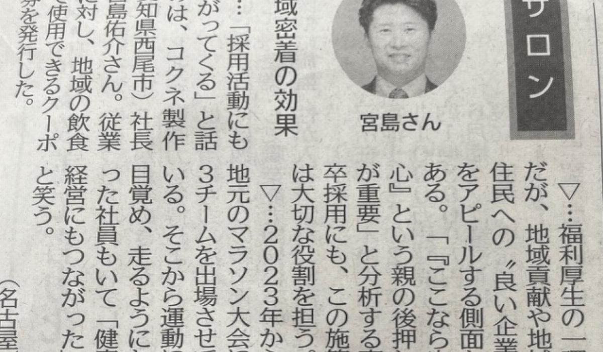 3月11日(月)の日刊工業新聞の3ページ目に、福利厚生のクーポン制度や碧南市民駅伝等、地域貢献について掲載されました。