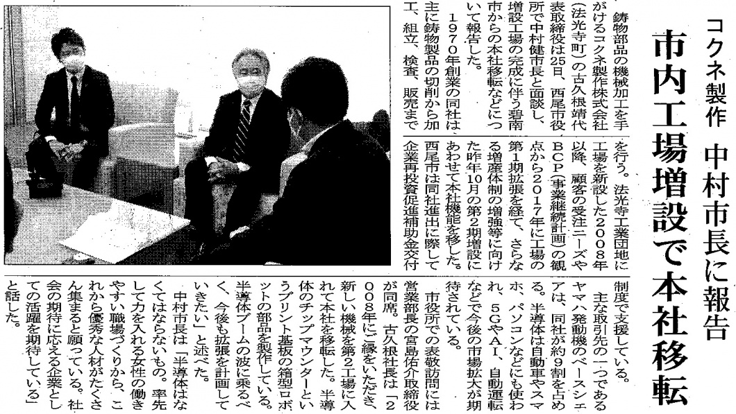 10月25日に行われた西尾市役所表敬訪問の様子が愛三時報に掲載されました。