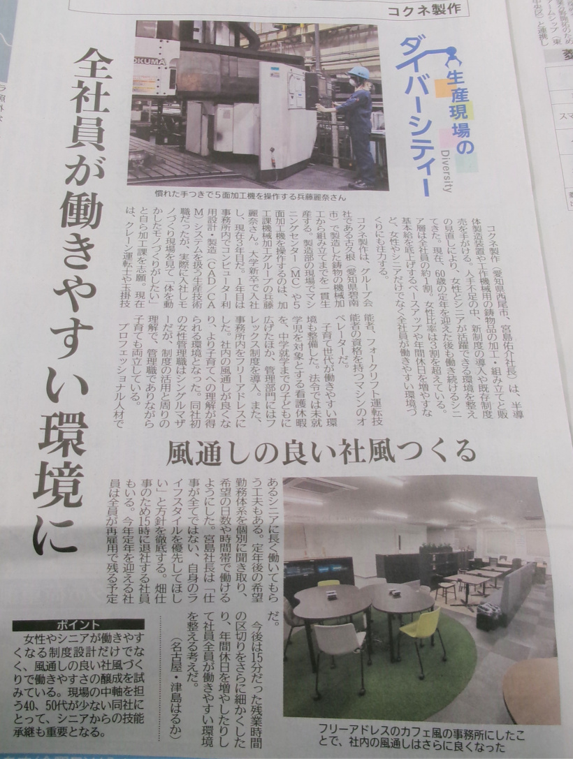 2023/03/23 日刊工業新聞にコクネ製作(株)が掲載されました 3月23日の日刊工業新聞にコクネ製作(株)が掲載されました! 働きやすい職場環境を整えるために行っている、様々な取り組みを書いていただきましたので、是非ご覧ください。