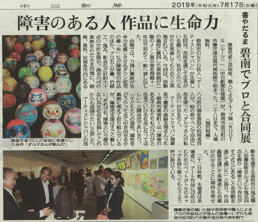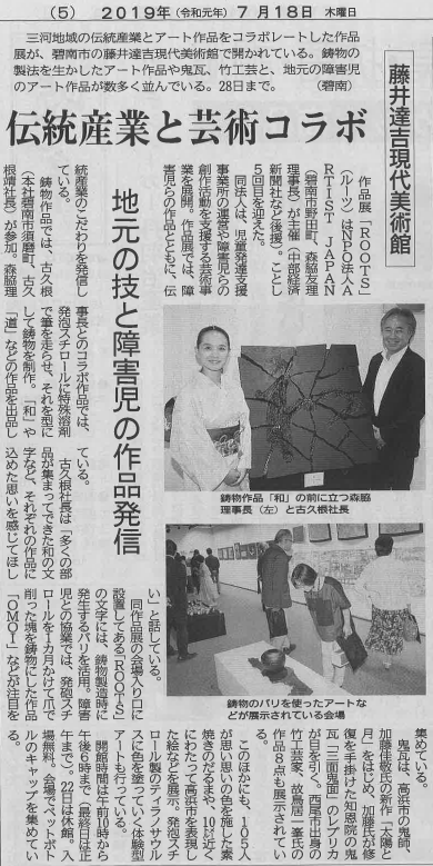 2019/07/22 ROOTS 新聞掲載 7月13日(土)~7月28日(日)にかけて碧南市藤井達吉現代美術館にて行われております、 ARTIST JAPAN様主催の作品展『ROOTS』が中部経済新聞・中日新聞に掲載されました。 詳しくは添付資料をご覧下さい。